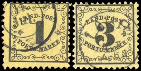 1862, 1 und 3 Kr. Landpost-Portomarken gestempelt, 1 Kr. einwandfrei mit Kurzbefund Stegmüller BPP, 3 Kr. zwei verkürzte Zähne, sonst einwandfrei, geprüft Engel BPP (ME 550,-) (Image)