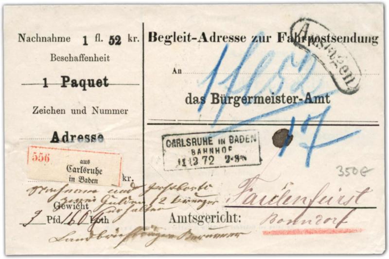 1872, Fahrpostbegleitadresse Nachnahme aus "CARLSRUHE IN BADEN BAHNHOF 11 12 72" nach Faulenfürst/Bonndorf, Ankunftsstempel "GRAFENHAUSEN BEI BONNDORF 14 12 72" und "BIRKENDORF 14 Dez", gute Qualität (Image)