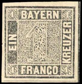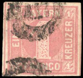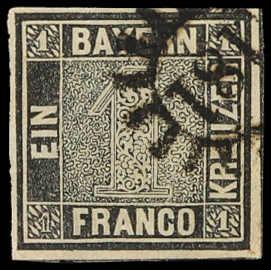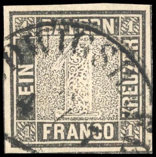 1849, 1 Kr. grauschwarz, gest. Einzelwert, Platte 1, entwertet mit Halbkreisstp. "(LU)DWIGSHAFE(N) 4 / 7...", farbfrisch und vollrandig mit Trennungslinien links, rechts und unten, einwandfrei, sign. Pfenniger und Fotoattest Stegmüller BPP (ME 3.500,-) (Image)