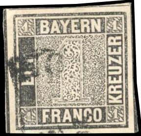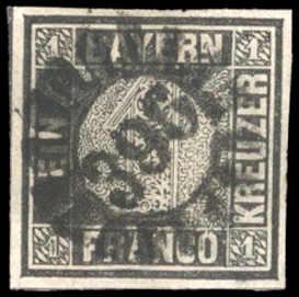 1849, 1 Kr. grauschwarz, Plattentyp II, voll- bis breitrandiger Schnitt, auf 2 Seiten Teile der Schnittlinien, gMR "396" (Würzburg), einwandfrei, signiert und Fotoattest Brettl BPP (ME 3.500,-) (Image)