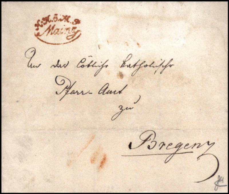 1832, K.K.Ö.M.P.MAINZ, roter Ovalstempel aus der Bundesfestung auf gef. Brief nach Bregenz (kl. Mgl.). Stempel-Seltenheit, Fotoattest Dr. Heschl (Image)