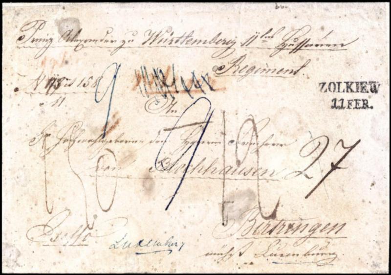 OESTERREICH, L2 ZOLKIEW 11/2 (heute in der Ukraine) auf schwerem, vollständigem Faltbrief (1854) mit Inhalt und Siegel des K.K. 11. Huszaren Regiment Prinz Alexander zu Württemberg, über Lemberg nach Birtringen, zuerst fehlgeleitet nach Lauenburg an der Elbe (damals als Herzogtum Teil von Dänemark), dann retour und richtig nach Luxemburg. Trotz Altersspuren ein bemerkenswertes Zeitdokument (Image)