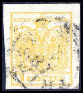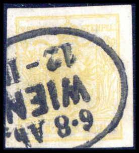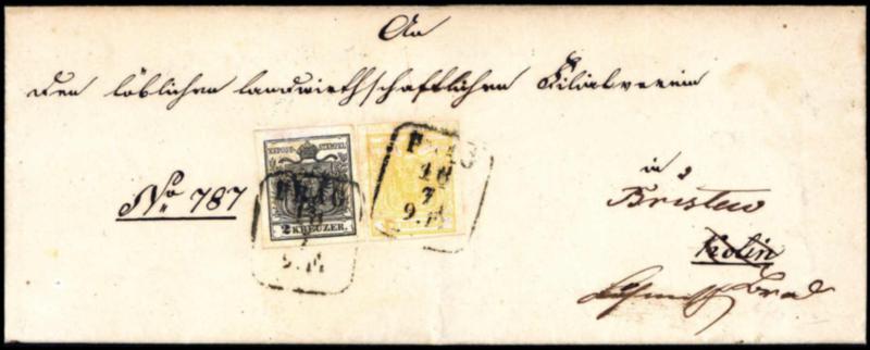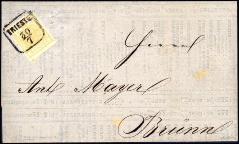 1 Kr., Luxusstück mit klarem R3 TRIESTE 30/7 (1853) auf blauer Drucksache nach Brünn, sign. Ferchenbauer. Katalogpreis: 550,- (Image)