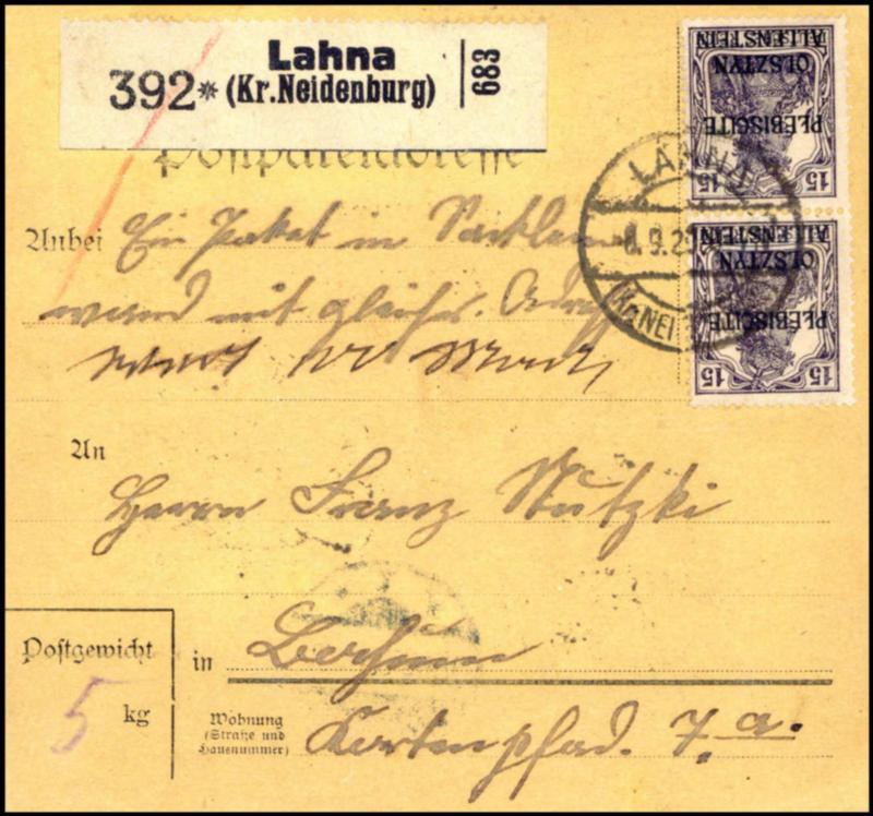 15 Pfg., fünfzehn Exemplare mit 5 Pfg. grün sowie DR Paar 60 Pfg. vs. und rs. auf seltener Wert-Paketkarte mit Stempel LAHNA 8/9 20, Fotobefund Gruber BPP (Image)