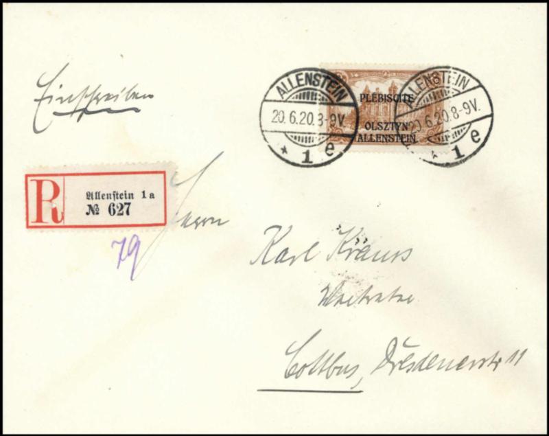 1,50 Mk., tadelloser, besonders schöner, philat. R-Brief mit Stempel ALLENSTEIN 20/6 20 (Image)