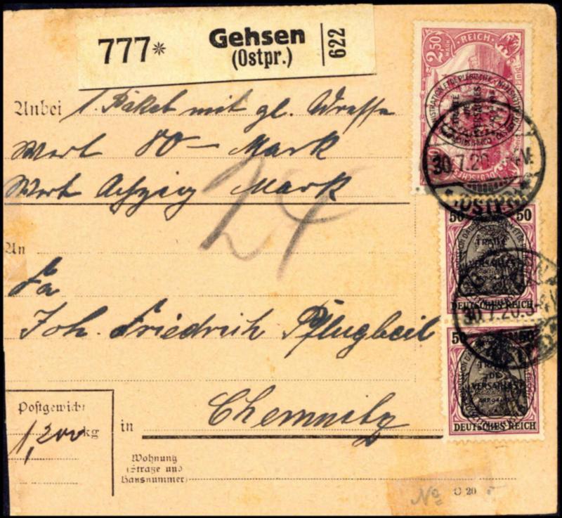 2,50 Mk. mit senkr. Paar 50 Pfg. auf Paketkarte n. Chemnitz, Stempel GEHSEN 30/7 20 (Image)