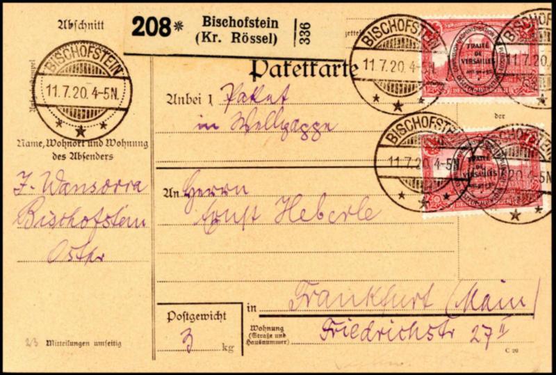 1 Mk., zwei Exemplare als reine Mehrfachfrankatur auf tadelloser Paketkarte mit Stempel BISCHOFSTEIN 11/7 20 nach Frankfurt M. adressiert (Image)