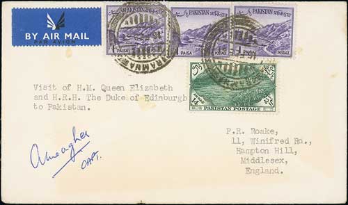 1961 Queen Elizabeth II and The Duke of Edinburgh royal tour to Pakistan, India, Iran and Nepal, covers flown on the royal plane and posted upon arrival at Rawalpindi or Ramna franked 17p or 20p, both signed by the pilot Capt. A. Meagher. Very scarce, tiny numbers of covers (often a single cover) flown on each leg of the tour. (Also see lot 1186). (2). Photo on Page 210. (Image1)