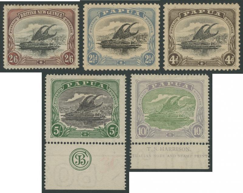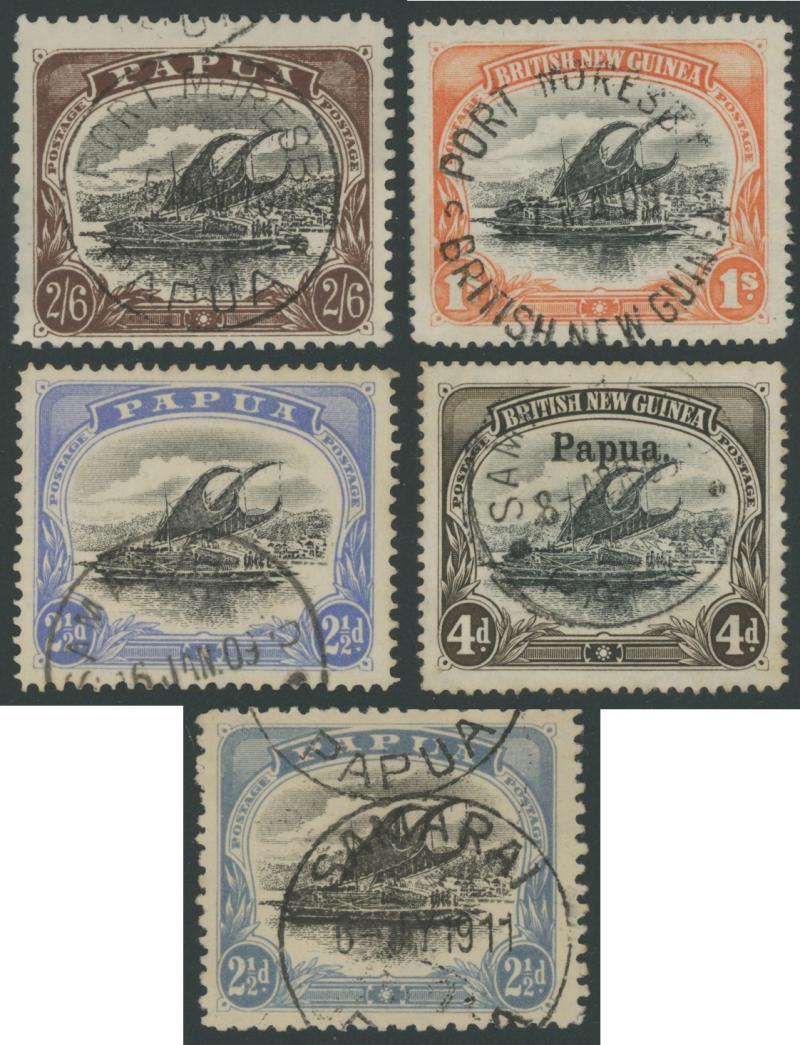 Lakatois used accumulation on Hagners from BNG 1d block of 4, 2d blocks of 4 & 6 plus singles 4d x4, 6d x2 & 1/- x2, Large 'Papua' overprints 4d, 6d x2 & 1/-, Small 'Papua' overprints Wmk Horizontal 2½d x6 and 2/6d x6 and Wmk Vertical 6d, 1/- x2 & 2/6d x3, Small 'PAPUA' Lithographs Wmk Upright Perf 12½ 2½d bright ultramarine x2 & pale ultramarine x2, 4d Deformed 'd' at Left & 1/- x3 and Wmk Sideways Perf 11 4d Deformed 'd' at Left and Perf 12½ 2½d black & dull blue x3 & 1/- x2, Large 'PAPUA' Lithographs Perf 11 2/6d and Perf 12½ 1/- block of 4, Monocolors 4d, 6d & 1/- 'CA' & 'JBC' monogram strips of 3 plus 2/6d single, plus a smattering of later issues noted Bicolours 9d x3, 1/3d x2 & 5/-, etc, some postmark interest, condition variable but many are fine to very fine, Cat £4500+.