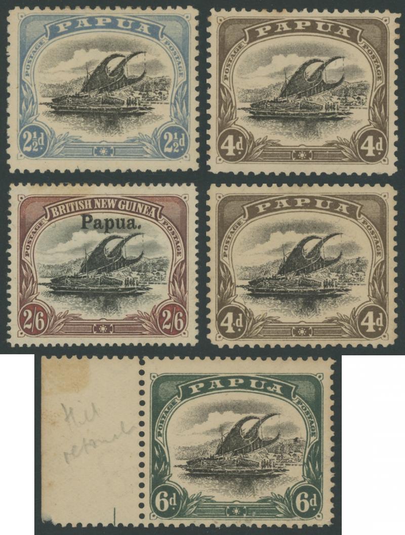 Lakatois varieties accumulation mostly annotated on Hagners predominantly mint ranging from Small 'PAPUA' Lithographs 2½d Perf 11 Thin 'd' at Left x2, 4d Deformed 'd' at Left & Broken '4', and 6d Cross on Hill, through White Leaves, Unshaded Leaves, Rift in Clouds, Pole to Sale, and more 'spicks & specks', noted BNG 2/6d (one toned perf), Large 'Papua' overprint 2/6d x2 (one no gum), Monocolours ½d horizontal pair with Double Perforations Between, 'AIR MAIL' overprint 3d horizontal pair with Double Perforations Between, plenty of multiples including Bicolours 2/6d 'OS' overprint block of 4 the lower-left unit with Deformed '2' of '2/6d' (minor tonespots), 'TWO PENCE' on 1½d block of 10 with 'POSTACE' variety, also imprints, monograms, etc, condition variable but many are fine to very fine, substantial catalogue value. An excellent opportunity for further study.