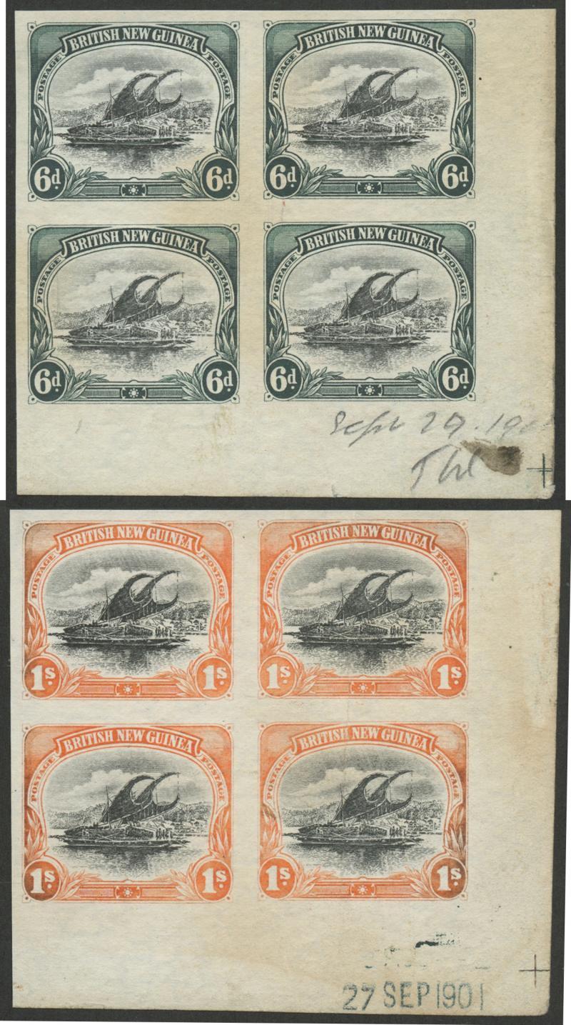 1901-05 British New Guinea ½d to 1/- matching set of corner blocks of 4 [21-22] from the lower-right of the imperforate imprimatur sheets of 30 (5x6) on ungummed horizontal-watermarked wove paper, margins large to enormous, each endorsed or handstamped at lower-right with dates between 17.9.1901 & 29.9.1901, 2½ to 3 months after the stamps were issued on 1.7.1901, some mostly minor blemishes/soiling largely confined to the reverse excepting the ½d & 1d which are noticeably soiled.