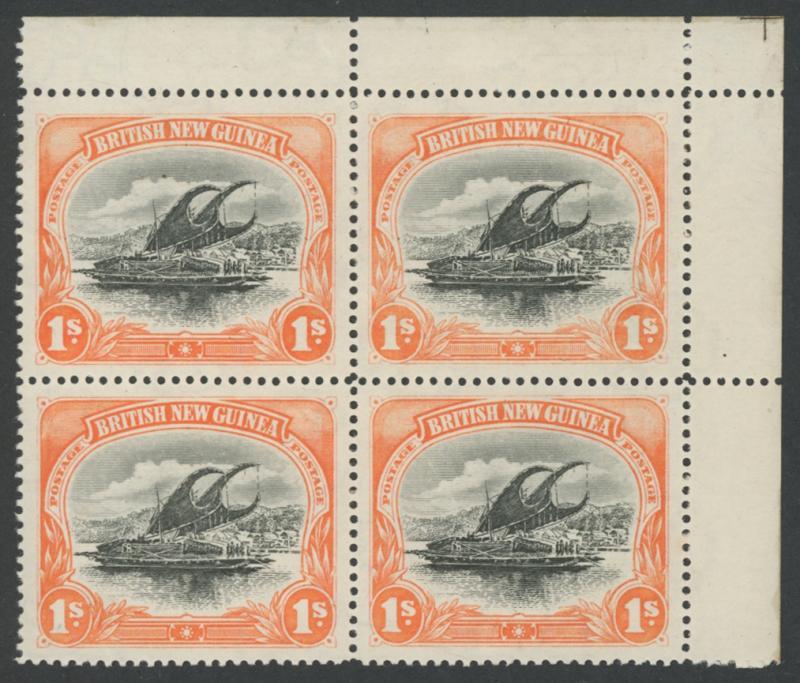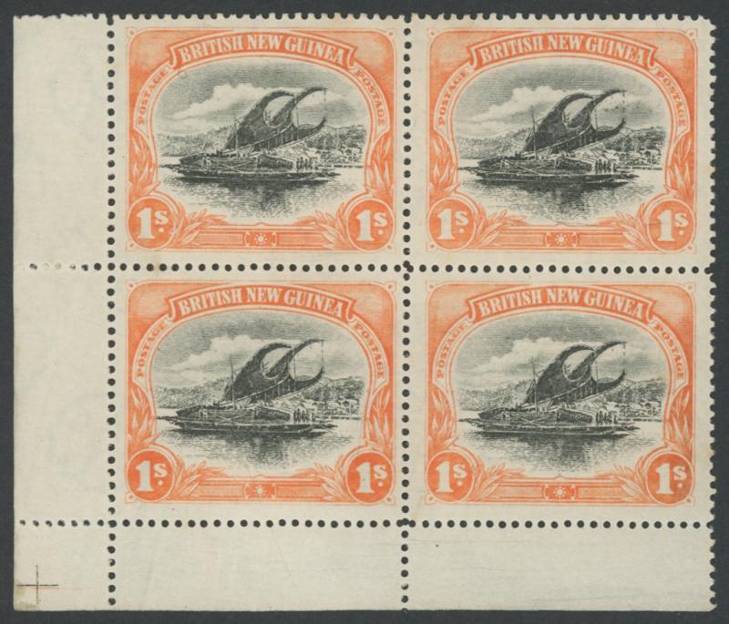 1901-05 British New Guinea Rosettes Watermark Horizontal Thick Paper Line Perf 14 1/- black & orange SG 7 block of 4 from the upper-right corner of the sheet with Printers' Guideline Cross in the margin, two small hinge remainders in the margins only, the stamps unmounted, a couple with very minor gum 'bubbling', Cat £340+ for mounted singles. (Image1)