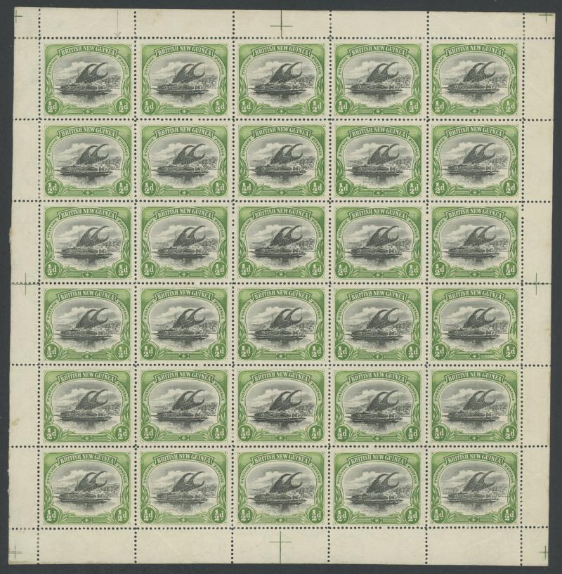1901-05 British New Guinea Rosettes Watermark Horizontal Thick Paper Line Perf 14 ½d black & yellow-green SG 1 complete sheet of 30 (5x6) with Printers' Guideline Crosses in the margins and White Leaves at Right [Pos 20] & Unshaded Leaves at Left [Pos 28], most units well-centred, some hinge remainders mostly in the margin just affecting two units in the upper row, the others all unmounted, a couple of very minor aging marks, Cat £720+ for mounted singles plus a significant premium for the varieties & complete sheet of Number One. The variety Diagonal Dash below 'P' of 'POSTAGE' at Right on [Pos 1] is not apparent. (Image1)