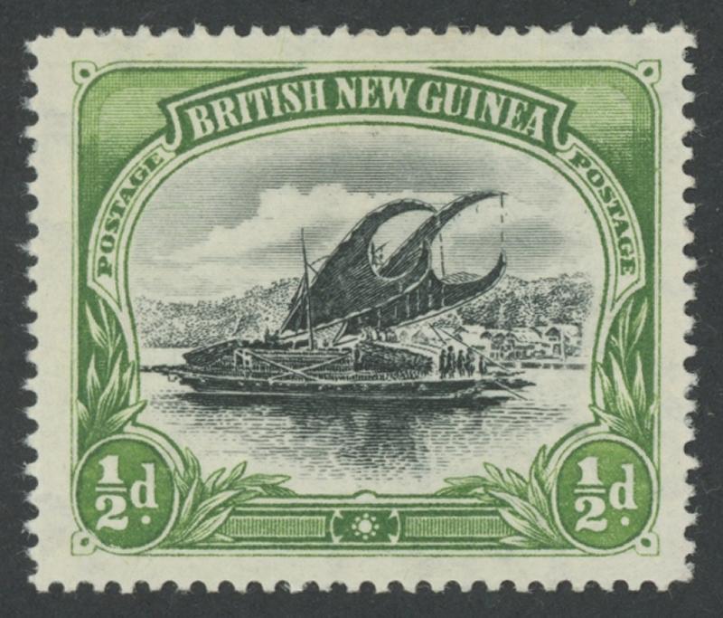 1901-05 British New Guinea Rosettes Watermark Horizontal Thin Paper Line Perf 14 ½d black & yellow-green SG 1a, quite well-centred, lightly mounted, Cat £350. Rare & under-rated; most examples seen are misidentified. Submitted to Chris Ceremuga for expertising. (Image1)