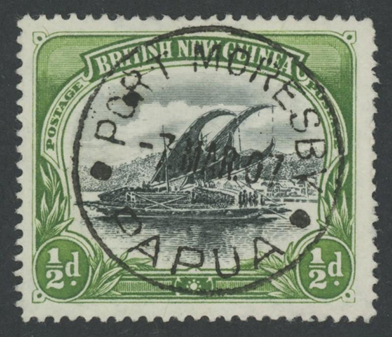 1901-05 British New Guinea Rosettes Watermark Horizontal Thin Paper Line Perf 14 ½d black & yellow-green SG 1a, quite well-centred, central Port Moresby 1907 cds cancel, Cat £275. Rare & under-rated; most examples seen are misidentified. Submitted to Chris Ceremuga for expertising. (Image1)