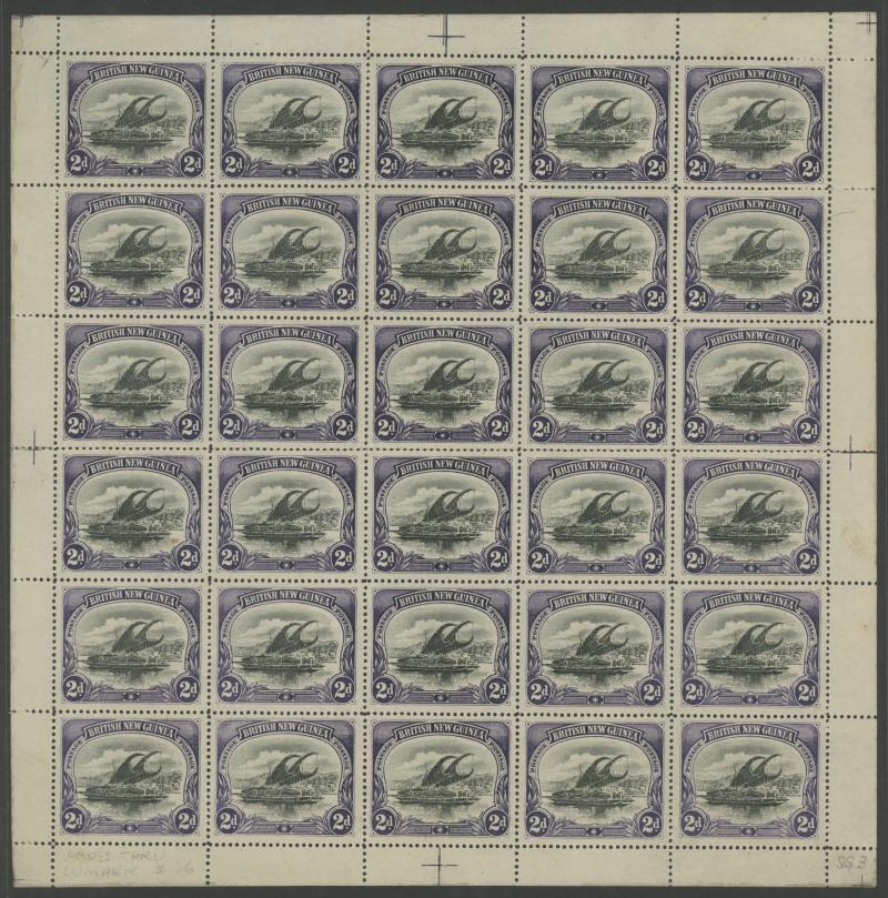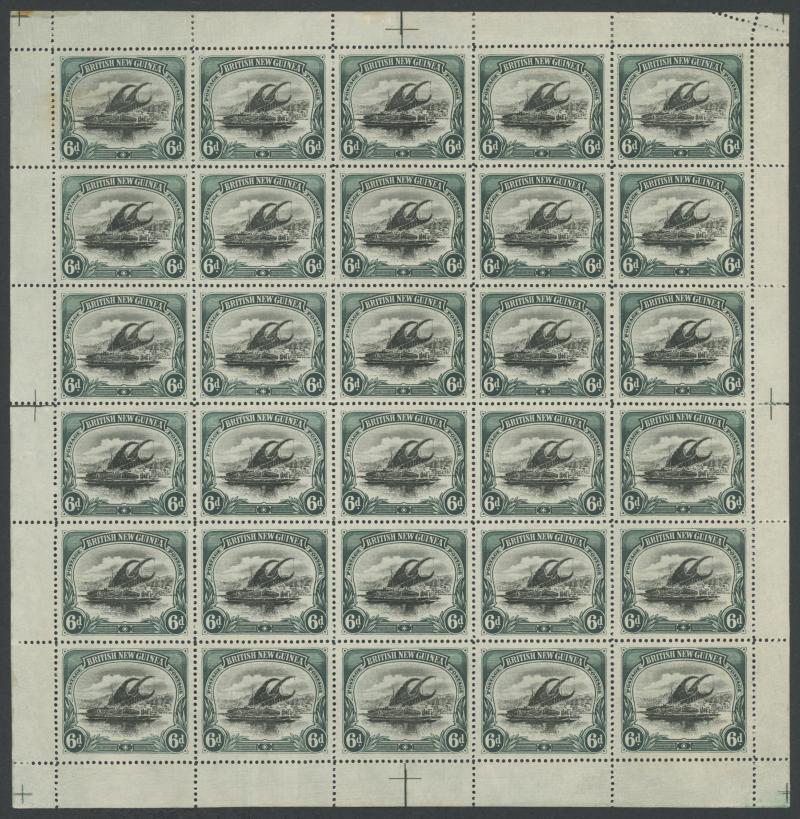 1901-05 British New Guinea Rosettes Watermark Horizontal Thick Paper Line Perf 14 6d black & myrtle-green SG 6 complete sheet of 30 (5x6) with Printers' Guideline Crosses in the margins and an abberant diagonal line of perforations in the upper-right margin, most units well-centred, the upper-right unit with a diagonal gum bend & the upper-left unit with gum toning, some hinge remainders in the margins only, the stamps all unmounted, Cat £2100+ for mounted singles plus premium for the varieties & complete sheet. (Image1)