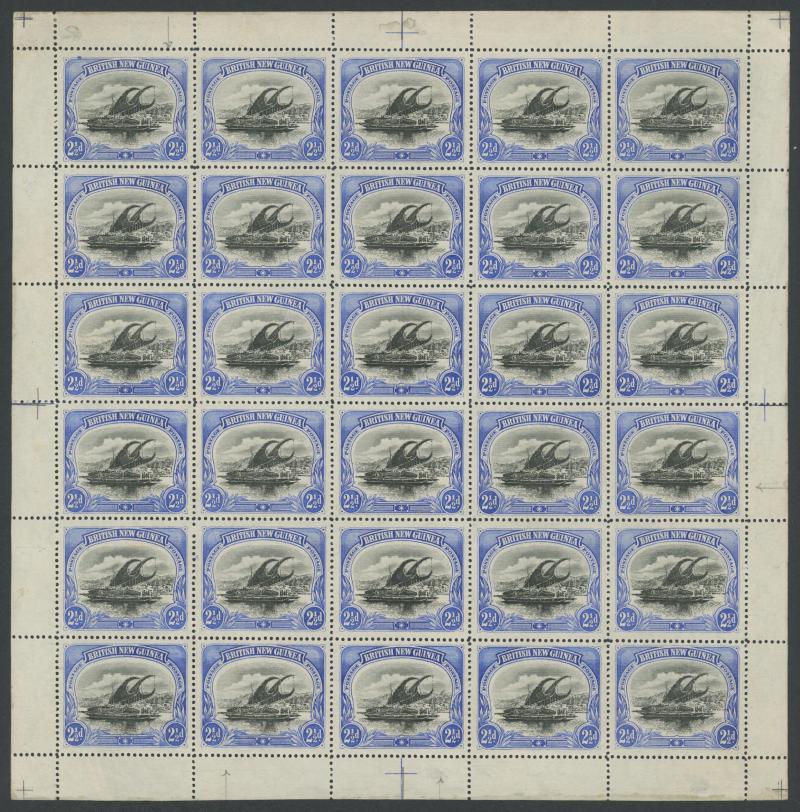 1901-05 British New Guinea Rosettes Watermark Horizontal Thick Paper Line Perf 14 2½d black & violet SG 4 complete sheet of 30 (5x6) with Printers' Guideline Crosses in the margins and Thin 'd' at Left [Pos 17] SG 4c (Cat from £425), White Leaves at Right [Pos 20], Unshaded Leaves at Left [Pos 27] & Sickle Flaw [Pos 28], most units well-centred, some hinge remainders in the margins only, a couple of units with small marks on the gum but all unmounted, Cat £1585+ for mounted singles plus a significant premium for the unlisted varieties & complete sheet. (Image1)