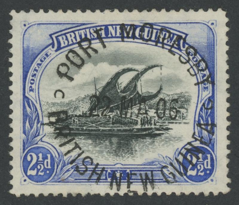 1901-05 British New Guinea Rosettes Watermark Horizontal Thin Paper Line Perf 14 2½d black & ultramarine SG 4a, well-centred, central Port Moresby 1906 unframed cds cancel, Cat £225. Rare & under-rated; most examples seen are misidentified. Submitted to Chris Ceremuga for expertising. (Image1)
