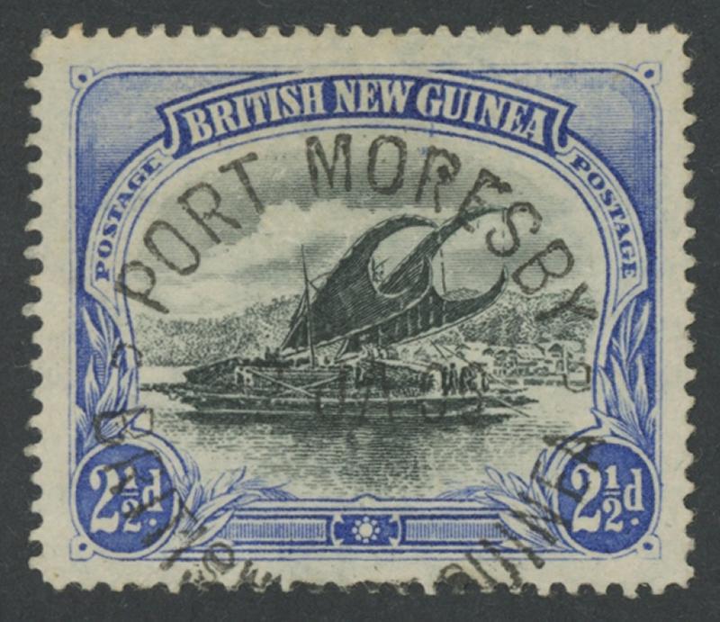 1901-05 British New Guinea Rosettes Watermark Horizontal Thin Paper Line Perf 14 2½d black & dull blue SG 4b, quite well-centred, central Port Moresby 1906 unframed cds cancel, Cat £475. A very fine example of this distinctive & under-rated shade, which is often misidentified. The last example we offered sold at our auction of 25.3.2011 for $920 (Sale 163 Lot ). Submitted to Chris Ceremuga for expertising. (Image1)