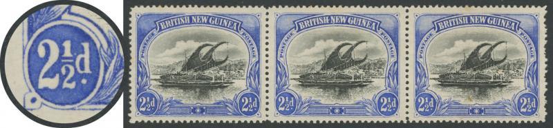 1901-05 British New Guinea Rosettes Watermark Horizontal Thick Paper Line Perf 14 2½d black & ultramarine SG 4 horizontal strip of 3 the central unit with Thin 'd' at Left [Pos 17] SG 4c, quite well-centred, the two non-variety units with a couple of minor aging marks, all with hinge remainders, Cat £500+ for singles. (Image1)