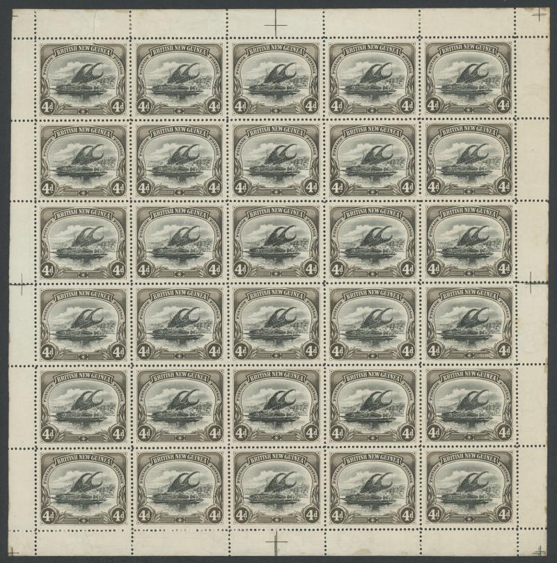 1901-05 British New Guinea Rosettes Watermark Horizontal Thick Paper Line Perf 14 4d black & sepia SG 5 complete sheet of 30 (5x6) with Printers' Guideline Crosses in the margins and Deformed 'd' at Left [Pos 18] SG 5a (Cat £800), most units well-centred, one unit at right with a small tonespot on the marginal perfs, some hinge remainders in the margins only, the stamps all unmounted, a couple with minor gum 'bubbling', Cat £2685+ for mounted singles plus a significant premium for the complete sheet. Peter Troy stated in his exhibit that only two complete sheets of this value had been recorded. (Image1)