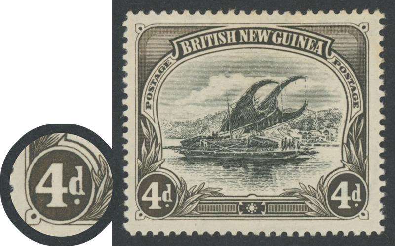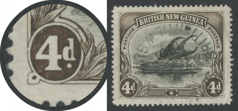 1901-05 British New Guinea Rosettes Watermark Horizontal Thick Paper Line Perf 14 4d black & sepia with Deformed 'd' at Left [Pos 18] SG 5a, well-centred, hinge remainder, Cat £800. (Image1)