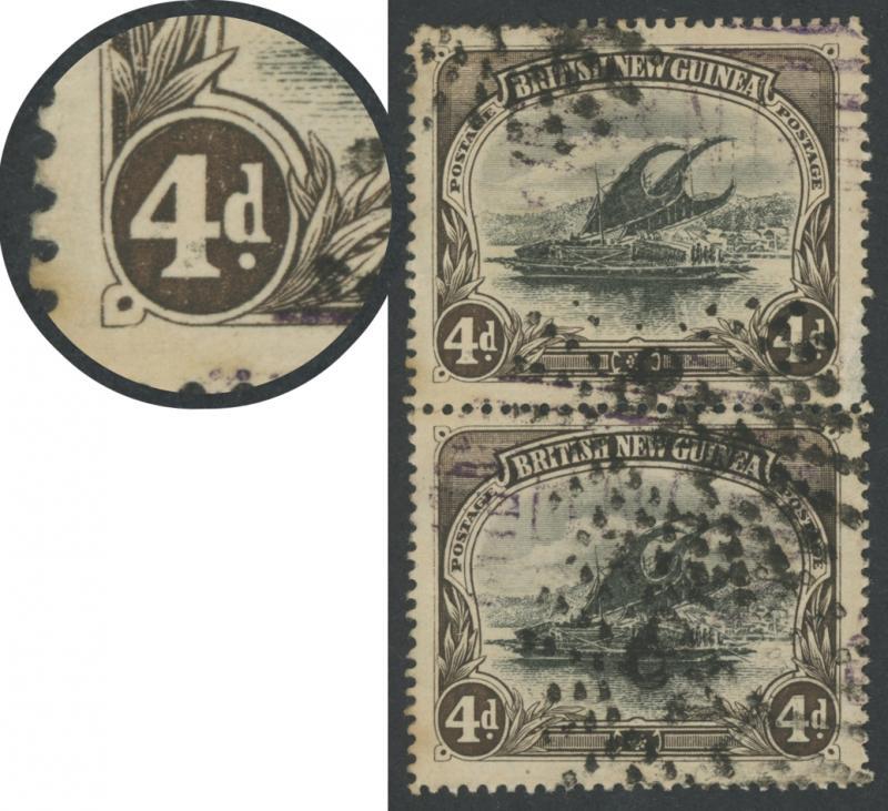 1901-05 British New Guinea Watermark Horizontal Thick Paper 4d black & sepia with Deformed 'd' at Left SG 5a being the upper unit in a pair with light 'BNG' cancels overstruck with bold Rays '148' cancels of Thursday Island all well clear of the variety, Cat £585+. (Image1)