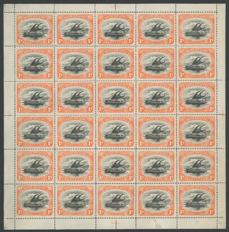 1901-05 British New Guinea Rosettes Watermark Horizontal Thick Paper Line Perf 14 1/- black & orange SG 7 complete sheet of 30 (5x6) with Printers' Guideline Crosses in the margins and Unshaded Leaves at Left [Pos 28] & Weak Oval at Upper-Left above Left '1s' [Pos 29], a small mark on the face in the lower margin below this unit, most units well-centred, some light oxidisation as usual, hinge remainders in the margins only, a little very minor perf separation & two units at upper-right reinforced otherwise the stamps all unmounted, Cat £2550+ for mounted singles plus a significant premium for the varieties & complete sheet. (Image1)
