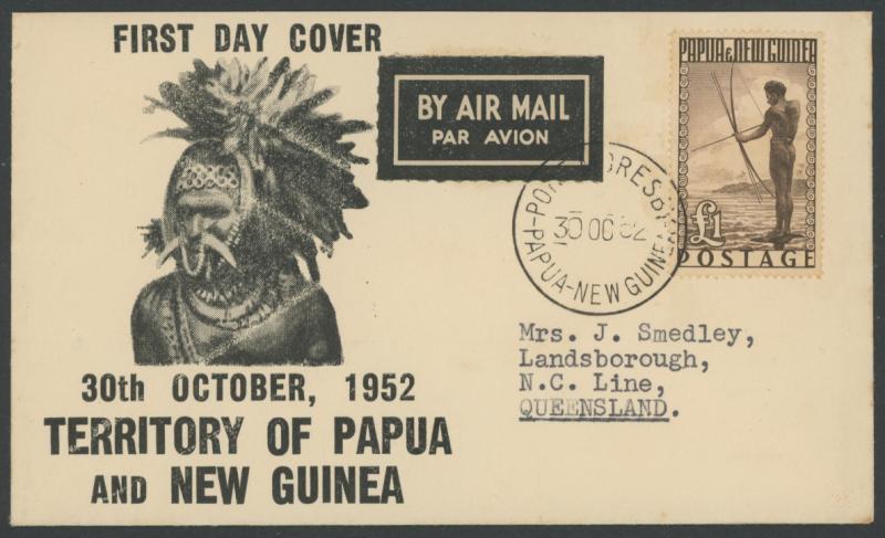 Australian stamps used in the Territory including 1945 with 'P.M.G'S DEPT C.1/QLD-AUST' relief cds used at Port Moresby, 1948 to NZ with 'BUKA PASSAGE' cds & 'SOHANA' mis-spelled R label, 1949 from Sohano (cds mis-spelled 'SOHANA' but the R label spelled correctly) with scarce 'MONEY ORDER OFFICE/RABAUL' backstamp, 1952 registered x2 both with black/white emergency-printing airmail labels, 1953 (3 March) KGVI Registration Envelope 1/0/½d combination franking uprated with PNG 1/- Lakatoi for "Comp 1/6" (Compensation) two days after the Australian stamps became invalid but accepted, also items from 'KAVIENG' (cds in violet) & 'HIGATURU', other postmark interest, a couple of registration receipts, etc, plus New Guinea 1937 OHMS with 'POSTAGE PAID/RABAUL' cds, 1938 with 2d tied by Brisbane cds & 'PAQUEBOT' alongside, 1938 registered air to "The Rt Hon J Lyons Prime Minister/Canberra" with Dated Airs 2d & 9d, 1939 air to Germany with 3d & 6d and 'AIR/MAIL' 1/-, and Papua 1942 Pictorials 1d x2 & 2d tied by Australian 'FIELD POST OFFICE/020' cds used at Murray Barracks, etc, mostly fine to very fine.