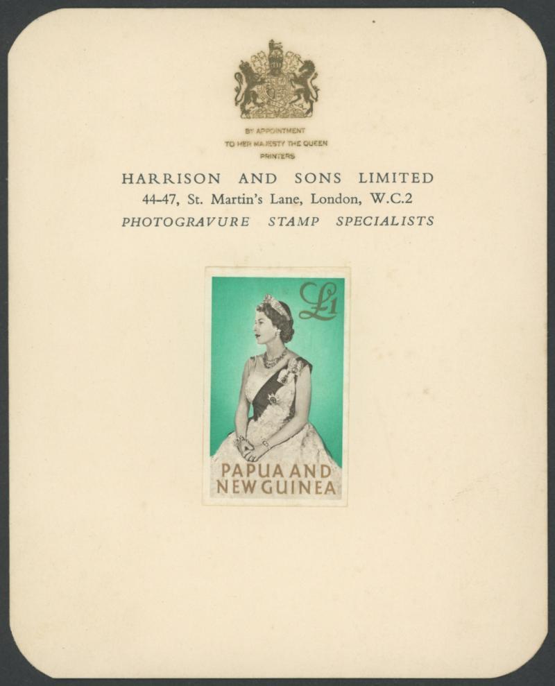 1963 Photogravure Pictorials £1 QEII imperforate single mounted on Harrison and Sons Limited presentation card, 'Superintendent Operations/("No 7")' handstamp in violet and small-part 'Dr. T.P. LIM/...' cachet on the reverse, a little minor foxing. (Image1)
