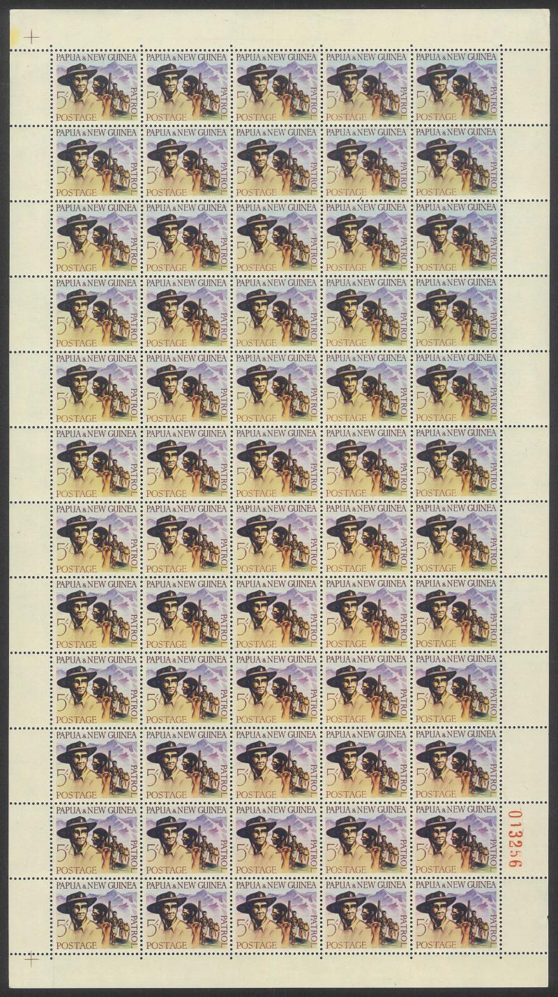 1961 Native Police 5/- Patrolman complete sheet of 60 with the Sheet Number in Red in the lower-right margin, all units unmounted & very fine. Unissued. The TPNG Post Office official bulletin of January 1962 stated that a forthcoming issue would feature "a Native Affairs patrol ..." It is believed the issue was abandoned in September 1962 and most of the sheets were destroyed. The only other complete sheet we have offered - "minor gum bends" - sold at our auction of 22.2.2024 for $7800 (Sale 255 Lot 874). Retail $45,000+ for singles. (Image1)