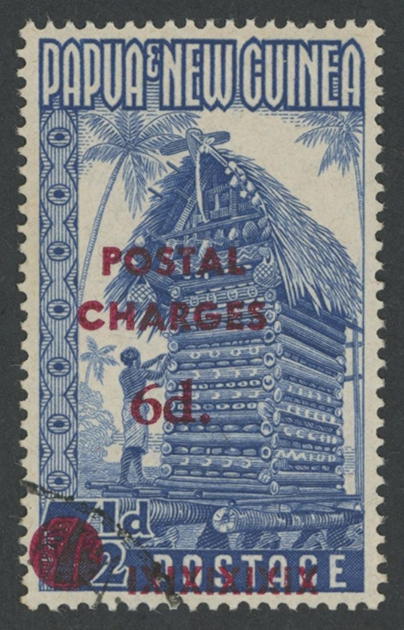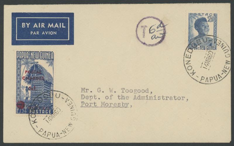 POSTAGE DUES: 1960 'POSTAL/CHARGES/6d./IXIXIXIXIX' Overprint on Pictorials 7½d Yam House SG D1, quite well-centred, tied by 'KONEDOBU/14MR60/PAPUA-NEW GUINEA' cds to local philatelic cover with Pictorials 2d blue tied by the same cds of the same day, taxed with 'T "6d"' circular handstamp in violet on the face, very fine. Submitted to Chris Ceremuga for expertising. (Image1)