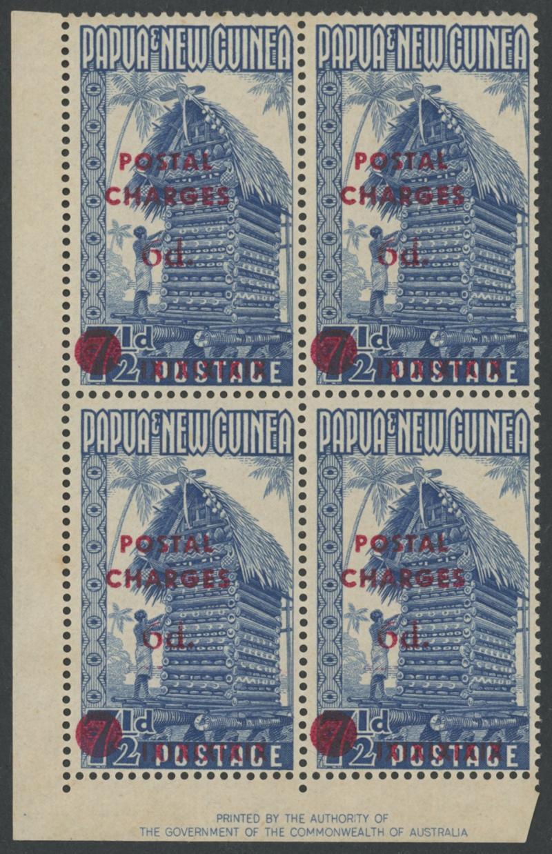 POSTAGE DUES: 1960 'POSTAL/CHARGES/6d./IXIXIXIXIX' Overprint on Pictorials 7½d Yam House Authority Imprint block of 4 from the lower-left corner of the sheet as SG D1 but with Forged Overprints, a few minor aging marks mostly on the reverse, Cat £3400+ for genuine singles. Friedl Certificate (1981) as genuine annotated by Chris Ceremuga (2004) "overprints are definitely forged"; RPSV Certificate (2010) as a forgery. (Image1)