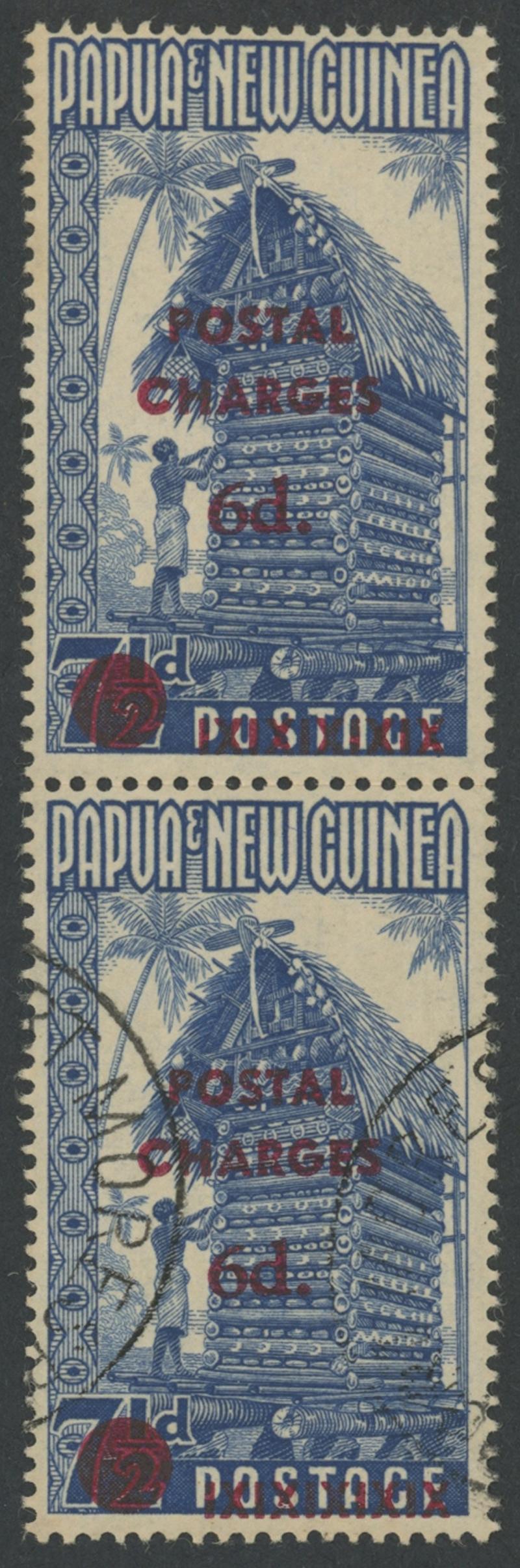 POSTAGE DUES: 1960 'POSTAL/CHARGES/6d./IXIXIXIXIX' Overprint on Pictorials 7½d Yam House SG D1 vertical pair, quite well-centred, a couple of very light aging marks on a few perfs, the upper unit uncancelled, the lower unit CTO with Port Moresby cds, both unmounted, Cat £1300+ for singles. Submitted to Chris Ceremuga for expertising. (Image1)