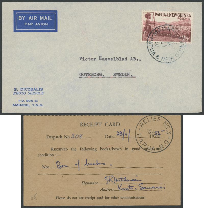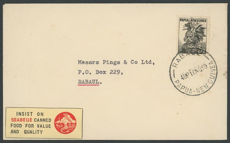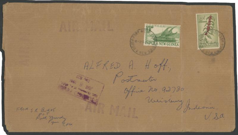 1950s-90s box of commercial mail with many pickings including Pictorials 1d from Wewak to Buin Methodist Mission with Army concession rate handstamp, 4d Cacao pair and 5d Cacao on South Pacific Post wrappers to Germany, 7½d Huts plus 9d Copra registered to Holland, 1/- Lakatoi on airmail postcard to Sweden, 1/- Dancer airmail to Solomons, 2/- Mask solo underpaid for air to East Germany, 2/- Dancer uprating Map 5d green long-format stationery envelope registered to Victoria, 2/3d Plane solos to Czechoslovakia, Germany & Switzerland, 2/6d Sheep airmail to Sweden (3d overpaid), 1/6d Rubber x2 plus 5/- Coffee (rare on cover) on oversized envelope airmail to Solomons, 1962 Malaria 1/- pair plus 3d airmail to USA, 1963 Election 2/3d airmail to UK, 1963 Games 1/- airmail to Solomons, 1964 Masks 2/5d on OHMS envelope from HMAS Tarangau, 1966 Butterflies 20c airmail to USA and 25c airmail to Germany, 1972 Shells 10c airmail to New Hebrides, a range of 1990s surcharges, etc, also 'POSTAGE PAID AT LAE' 1956 in black & 1961 in red, Port Moresby Librarian OHMS postcards x4 one with 'RELIEF NO.3' used at Samarai another from 'GOILALA', advertising, ship endorsements and plenty more, generally fine to very fine.