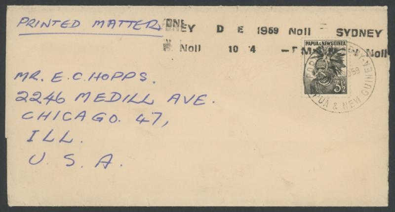 1959 (Nov) homemade wrapper endorsed "Printed Matter" to Illinois with rare franking of Native 3½d black tied by Port Moresby cds & Sydney parcel roller. Rodney Perry's census of PNG covers included only six frankings of this stamp. (Image1)