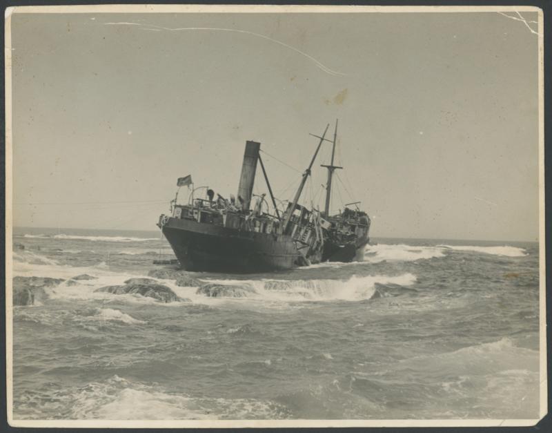 1942 (Nov) series of mostly small prints recording the heavy seas and consequent wreck of SS 'Kapara' just off Flinders Island (Tasmania), several of the vessel breaking-up (the largest of 250x195mm has a few faults), ropes rigged between the ship & shore bringing over the engine & anchor etc, others of the crew & passengers, etc, also 1930s (?) shot of the ship in calm waters, generally very fine.