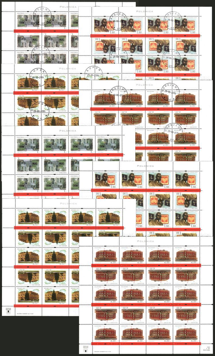 Sc.3582/3585, 2001 Buildings related to Polish culture in USA, the set of 4 values in COMPLETE SHEETS, MNH and also used (cancelled to order), containing 8 tete-beches each, excellent quality! (Image)