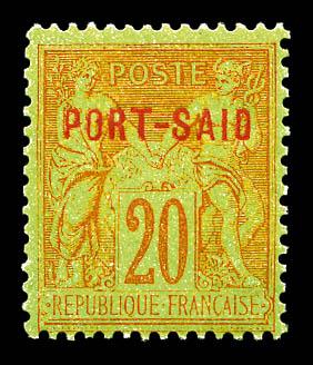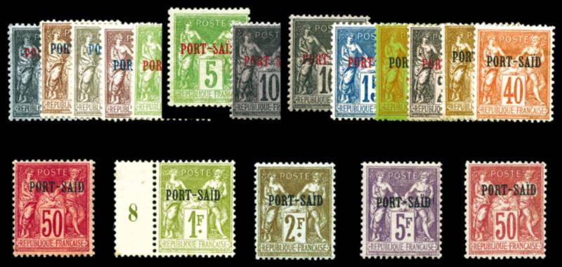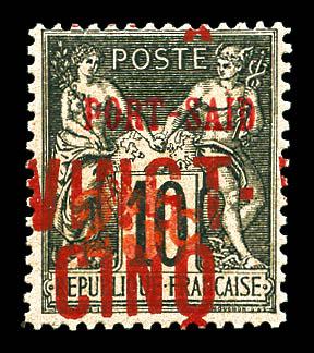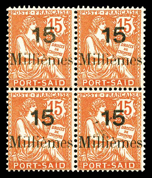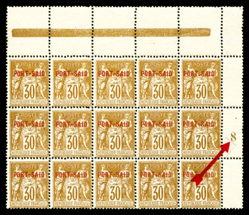 N°11Ab, 30c brun, tiret entre Port et Saïd descendu (case 5) tenant à normaux en bloc de 15 exemplaires coin de feuille avec millésime '8'. SUPERBE. R.R. (certificats) Qualité: ** Cote: 13800 euros (Image)