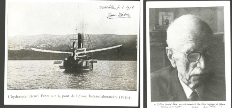 POSTE AERIENNE. AVIATEURS. Lettre. Henry FABRE (1882-1984) ingénieur aéronautique, inventeur du 1er Hydravion avec flotteurs. 3 reproductions photos 305x240mm annotées et autographiées en 1972. - TB (Image)