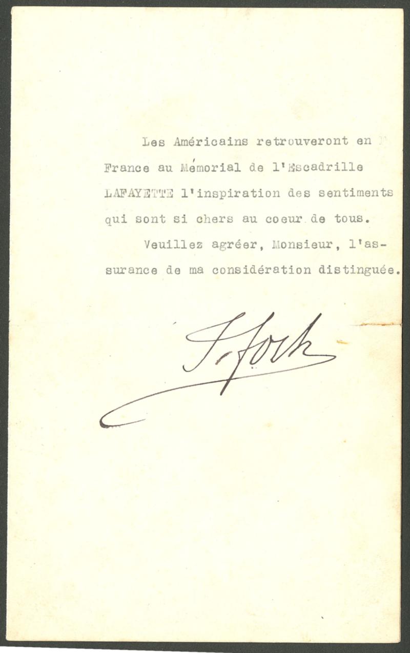 POSTE AERIENNE. AVIATEURS. Lettre. Maréchal FOCH, autographe sur lettre dactylographiée du 22 Mai 1925, relative à l'escadrille La Fayette et au monument érigé en son honneur. - TB. - R (Image)