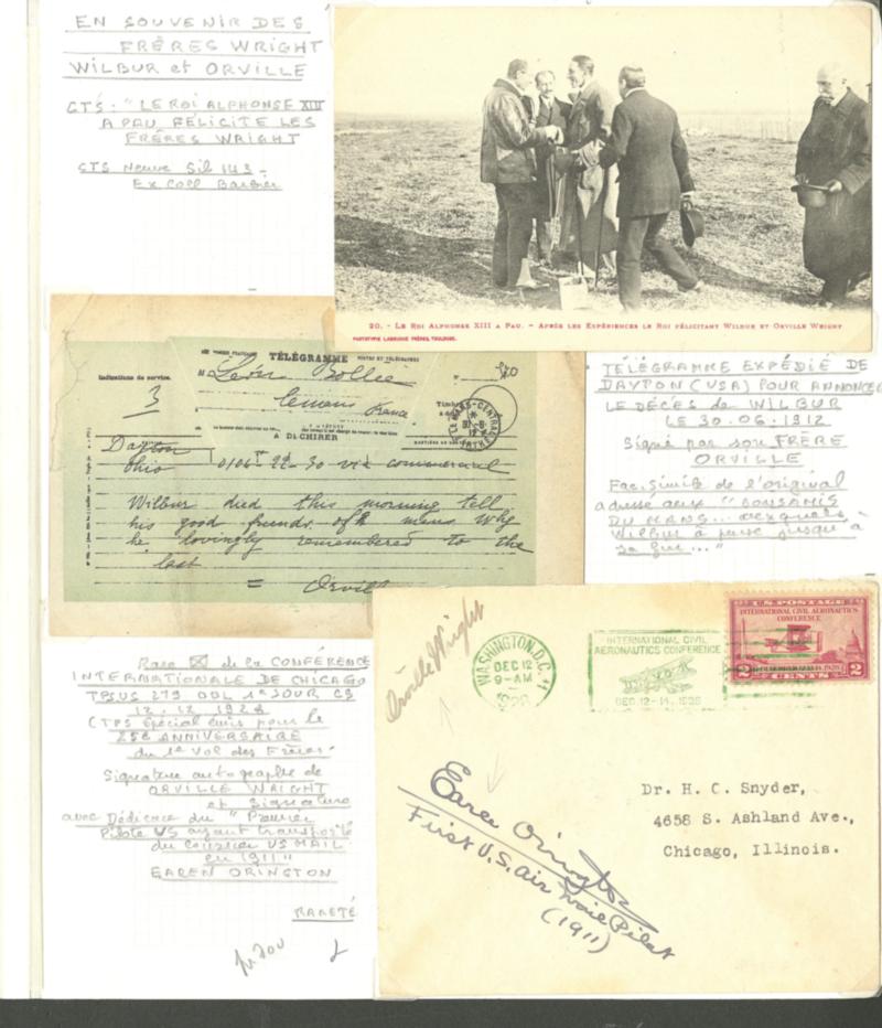 POSTE AERIENNE. AVIATEURS. Lettre. Frères WRIGHT. CP Sil. 143, fac-similé du télégramme envoyé par Orville des USA pour annoncer le décès de Wilbur 30 Juin 1912 et une enveloppe de la Conférence internationale de Chicago afft USA 279 obl CS 1er jour 12 Déc 28, avec autographe d'Orville. - TB. - R (Image)