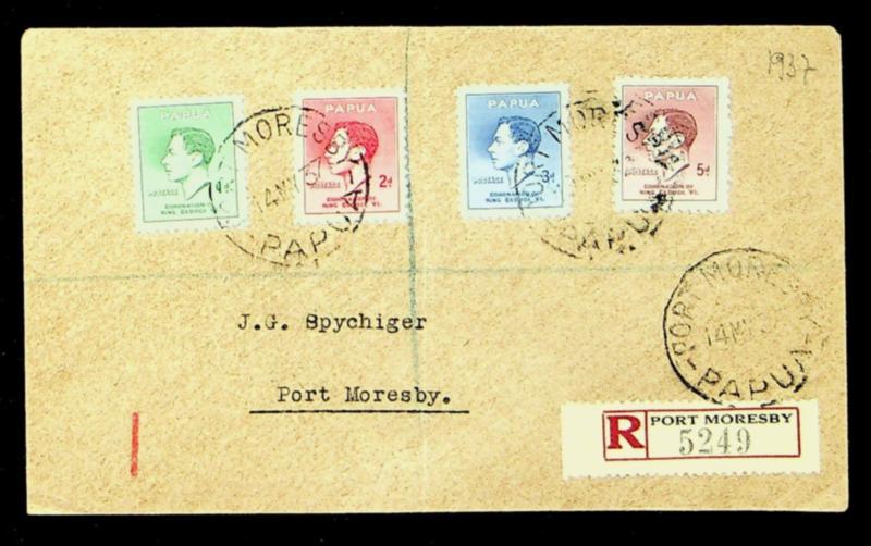 Papua 1937 KGVI Coronation 4v on Regd cover sent locally in Port Moresby (Image)