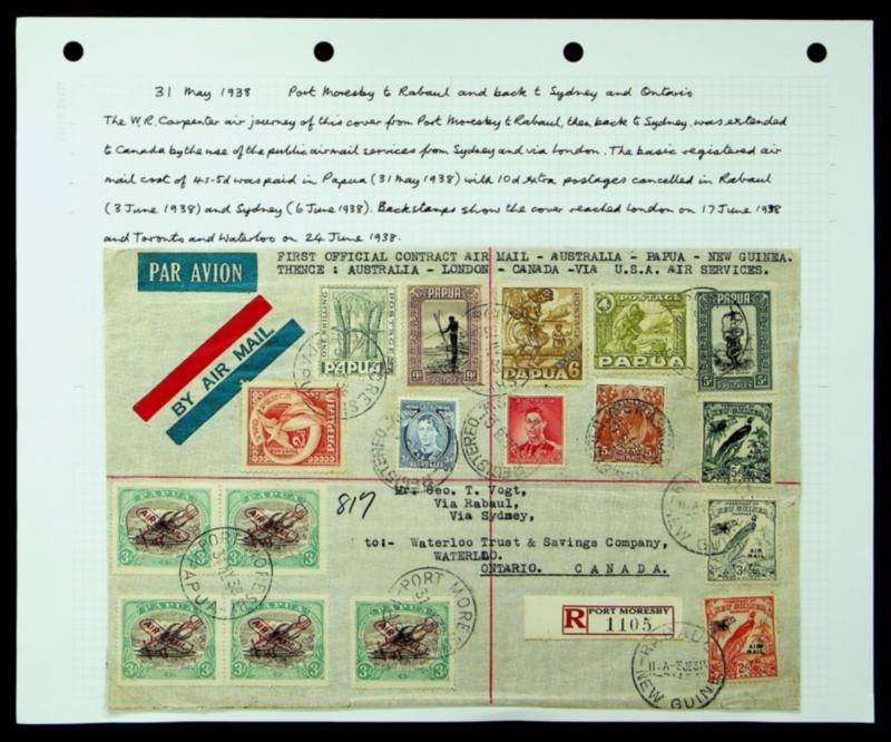Papua, New Guinea, Australia 1938 17v mixed franked Regd airmail cover from Port Moresby via Rabaul/ Sydney to Canada w/ transit cds at back (Image)