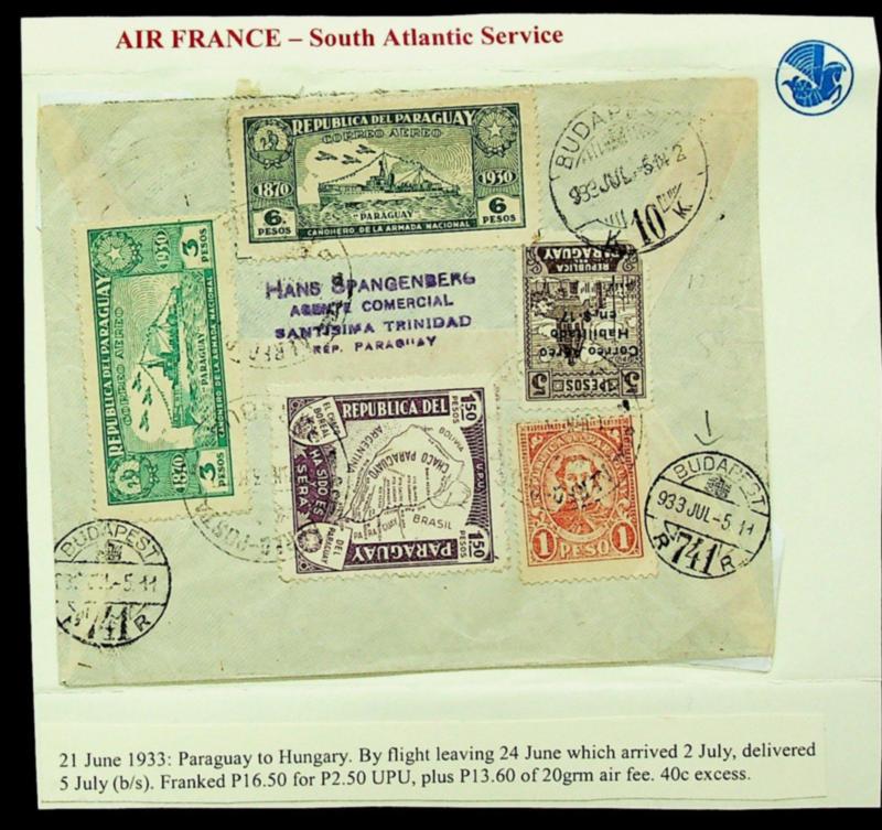 Paraguay 1933 5v on Air France-South Atlantic Service airmail cover to Budapest Hungary (Image)