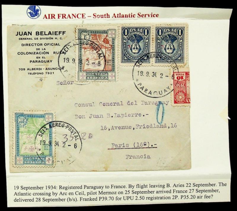 Paraguay 1934 10v franked on both sides of Air France-South Atlantic Service airmail Regd cover to Paris France (Image)