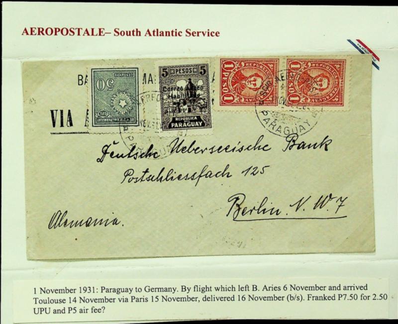 Paraguay 1931 4v on Aeropostale-South Atlantic Service cover via Paris France to Berlin Germany (Image)