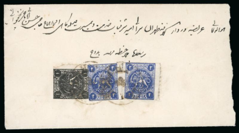 2sh. blue, rouletted, two examples type 'B' and 'C', used with 1sh. black, rouletted, type 'A', on 1876 cover from Rescht to Tehran, tied by RESCHT/30.3.76 cds, very fine and a rare franking; ex Farahbakhsh and Youseffi. (Image)