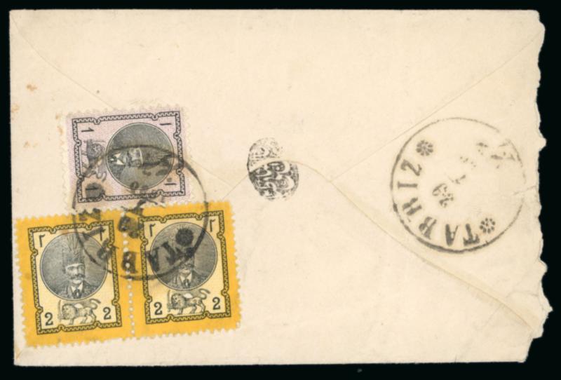 1876 First Portrait Issue 1sh perf.12 in combination with Second Portrait Issue 2sh perf.13 pair, tied on reverse by Tabriz cds with Teheran arrival on front; and Second portrait issue 1s perf.13 pair and two singles tied to reverse of cover tied by Boushire cds; a very fine and attractive pair of covers. (Image)