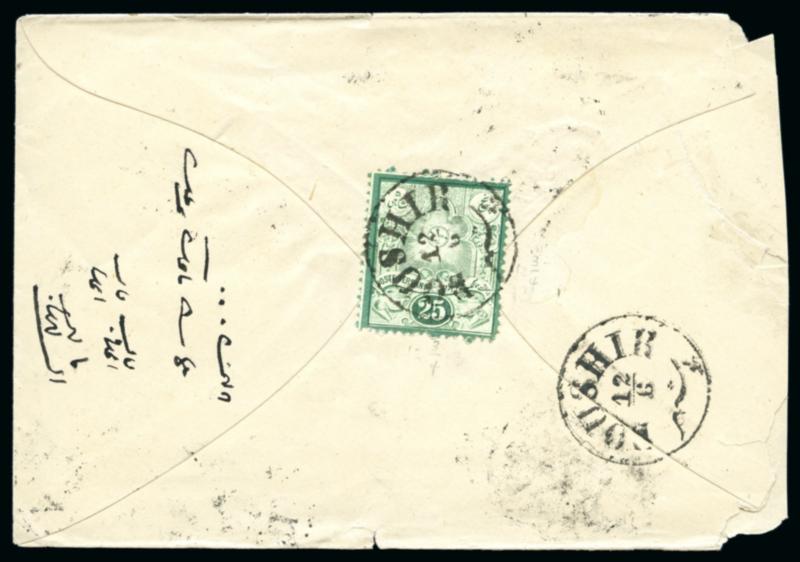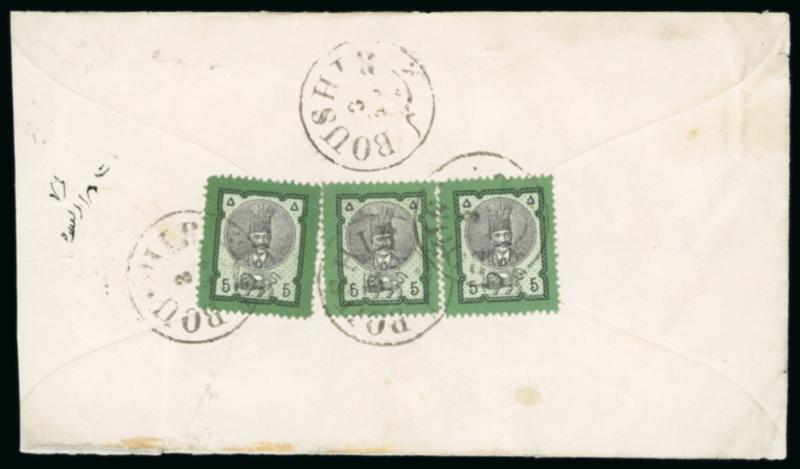 1881 (Oct 3) cover from Bushire to Yazd franked on reverse with 5ch green borders single and pair that is paying the triple rate, neatly cancelled by three Boushir cds and further strike above, with original contents. (Image)